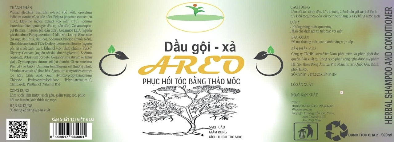 THÀNH PHẦNWater, gleditsia australis extract (bồ kết), oroxylum indicum extract (Cao núc nác), Eclipta prostrata extract (cỏ mực), Eleusine indica extract (cỏ mần trầu), sodium laureth sulfate (nguồn gốc dầu cọ, dầu dừa), Cocamidopropyl Betaine ( nguồn gốc dầu dừa), Cocamide DEA (nguồn gốc dầu dừa), Polyquaternium-7 (dầu xả), Lauryl Glucoside (từ ngô, dầu dừa, dầu cọ), Sodium Chloride (muối biển), Dimethiconol (and) TEA-Dodecylbenzenesulfonate (nguồn gốc từ chiết xuất trà ), Ethanol (cồn thực phẩm), PEG-7 Glyceryl Cocoate (nguồn gốc dầu dừa và glycerin), Sodium benzoate, Potassium Sorbate, Coriandrum sativum oil (mùi già) , Cymbopogon citratus oil (sả chanh), Citrus maxima Peel oil (vỏ bưởi), Ocimum tenuiflorum oil (hương nhu), Mentha arvensis oil (bạc hà), Ageratum conyzoides extract (cỏ hôi), Citric acid, Guar Hydroxypropyltrimonium Chloride, Hydroxyethylcellulose, Polyquaternium-10, Climbazole, Panthenol (Vitamin B5)PHỤC HỒI TÓC BẰNG THẢO MỘCCÔNG DỤNGLàm sạch, làm mượt, sạch gàu, giảm rụng tóc, phục hồi tóc hư tổn, kích thích tóc mọc.