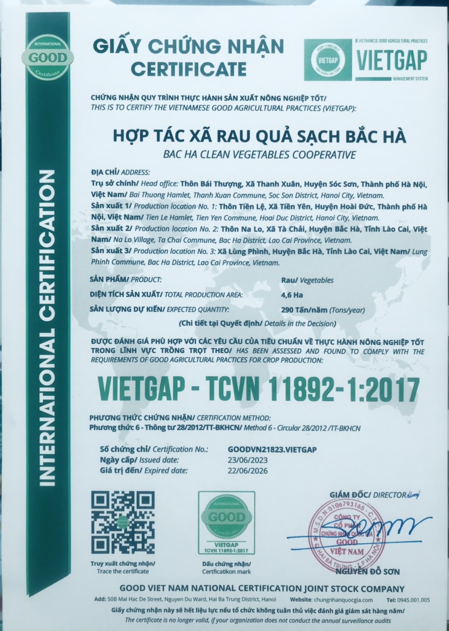 + Sản phẩm được quản lý sản xuất và giám sát chất lượng bởi HTX Rau quả sạch Bắc Hà