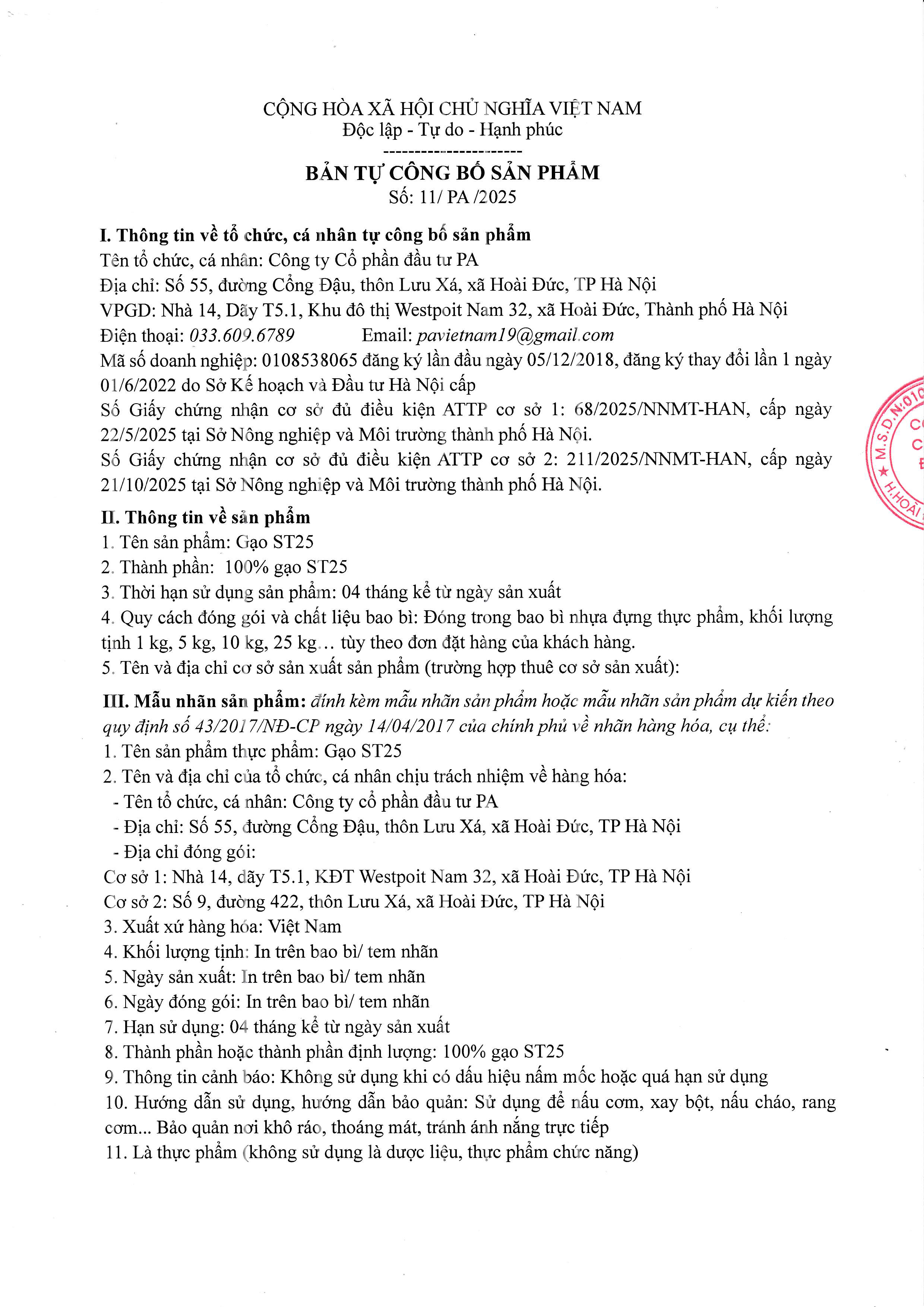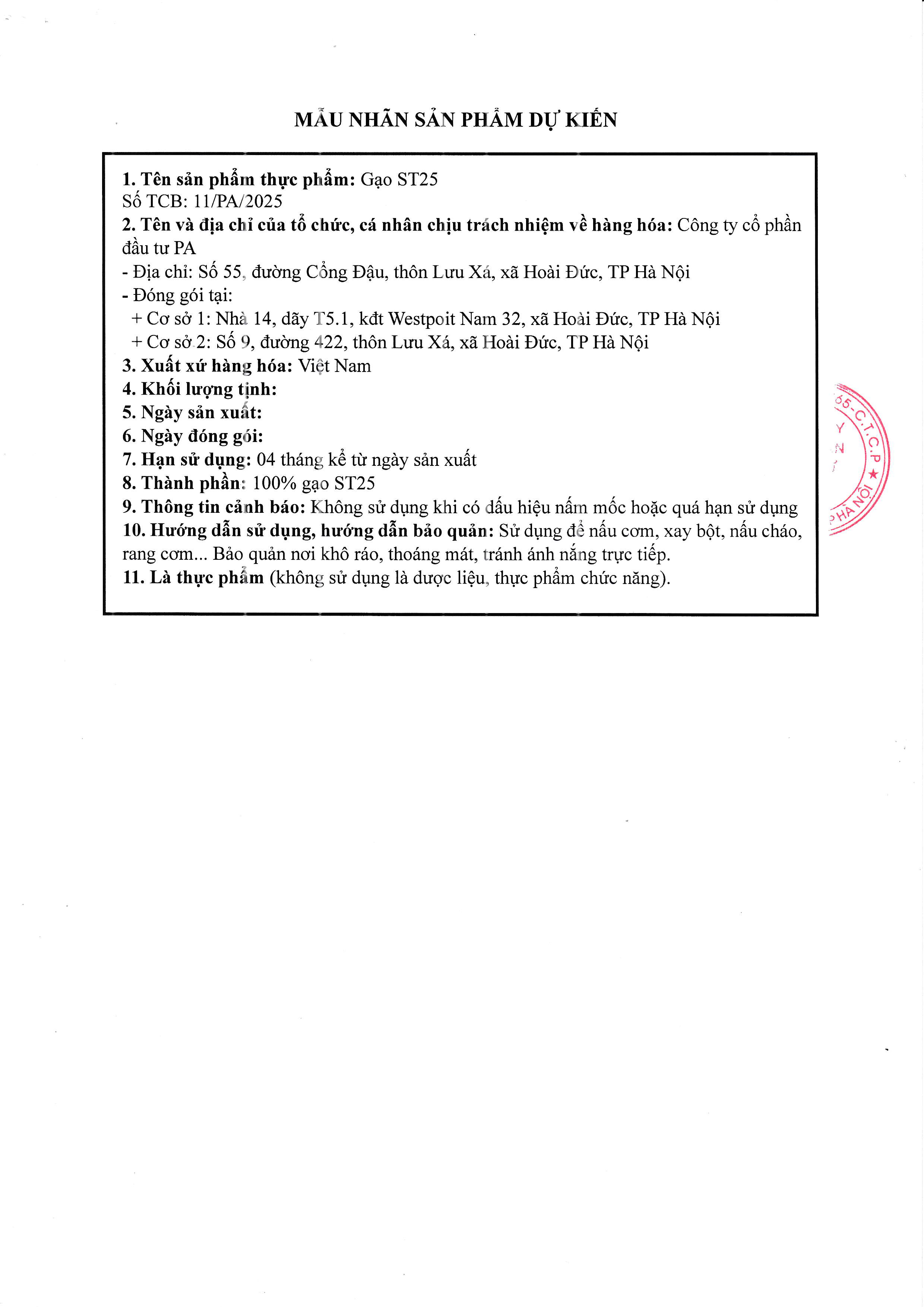 Nguồn gốc: - Công ty TNHH Vinh HiểnĐịa chỉ: Số 1102, Ấp Thạnh Phong, xã Phú Thành, tỉnh Đồng Tháp- Doanh nghiệp tư nhân xay xát Thuận PhátĐịa chỉ: thôn Lương Đông, xã Lương Sơn, tỉnh Lâm Đồng- Công ty TNHH Lương Thực Long VũĐịa chỉ: thôn Thọ Lương, xã Bình Mỹ, tỉnh Ninh Bình- Công ty TNHH Gạo Tân HưngĐịa chỉ: Lô A4 Cụm Công nghiệp An Thạnh, xã Cái Bè,tỉnh Đồng Tháp