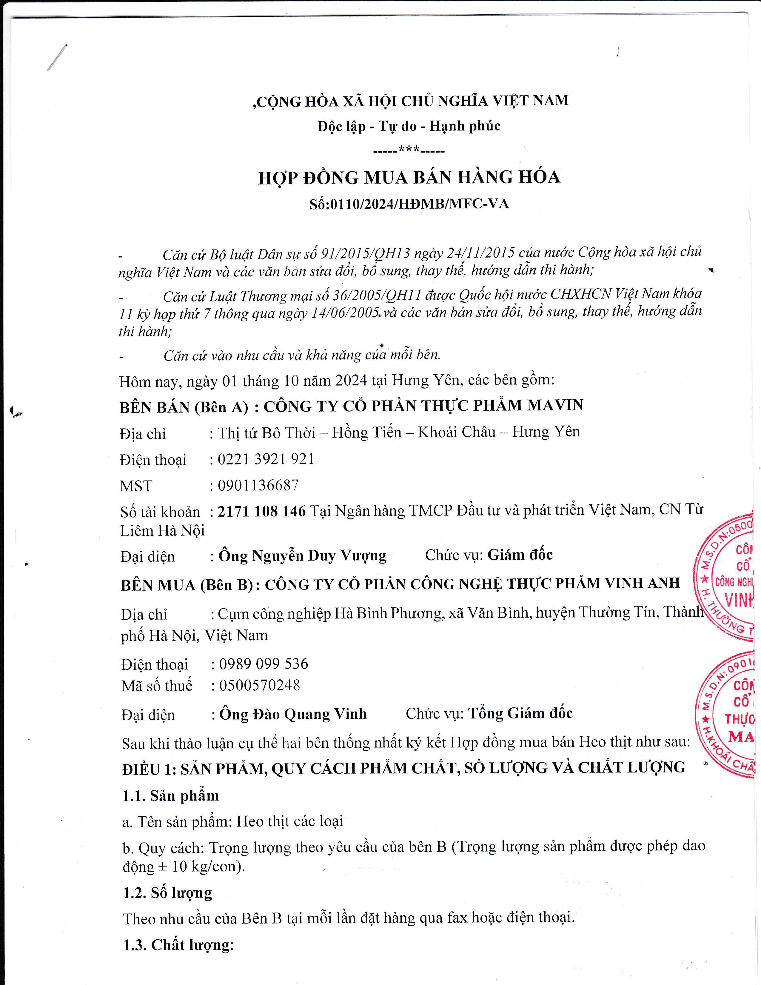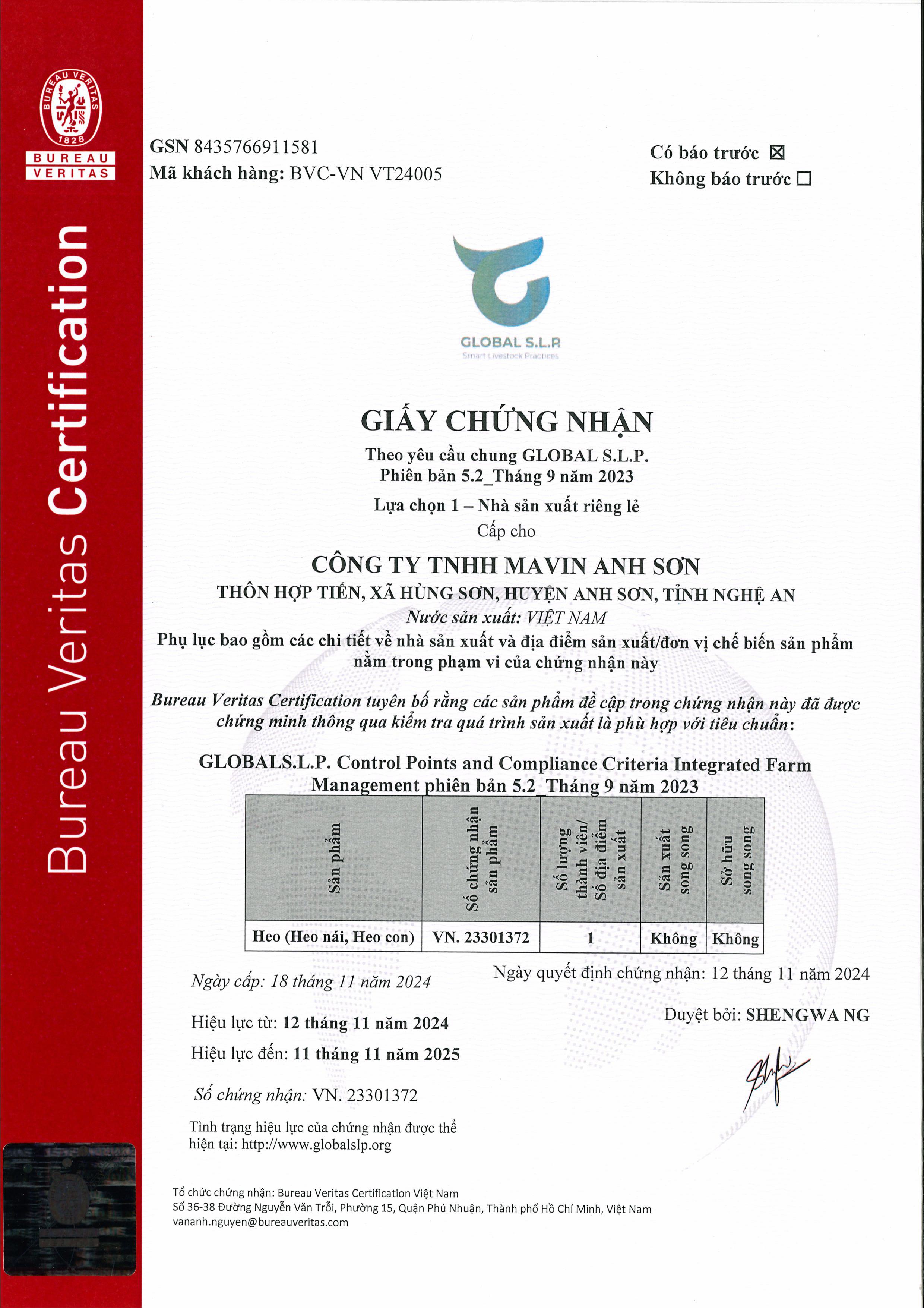 1. Xuất xứ của sản phẩm - Công ty Phú Thiên Tân đang hợp tác với Công ty CP CÔNG NGHỆ THỰC PHẨM VINH ANH (là thương hiệu rất uy tín tại thị trường thực phẩm Hà Nội, cung cấp sản phẩm thịt lợn truy xuất nguồn gốc được các tổ chức, người tiêu dùng quan tâm và tin tưởng). - Hồ sơ Công ty CP Công nghệ Thực phẩm Vinh Anh + GCN ISO 22000:2018 ngày cấp 20/04/2022 + GCN đăng ký doanh nghiệp số 3600224423-108 ngày cấp 09/06/2024, hết hạn ngày 08/06/2027 + Địa chỉ: CCN Hà Bình Phương, huyện Thường Tín, thành phố Hà Nội, Việt Nam + Số điện thoại: