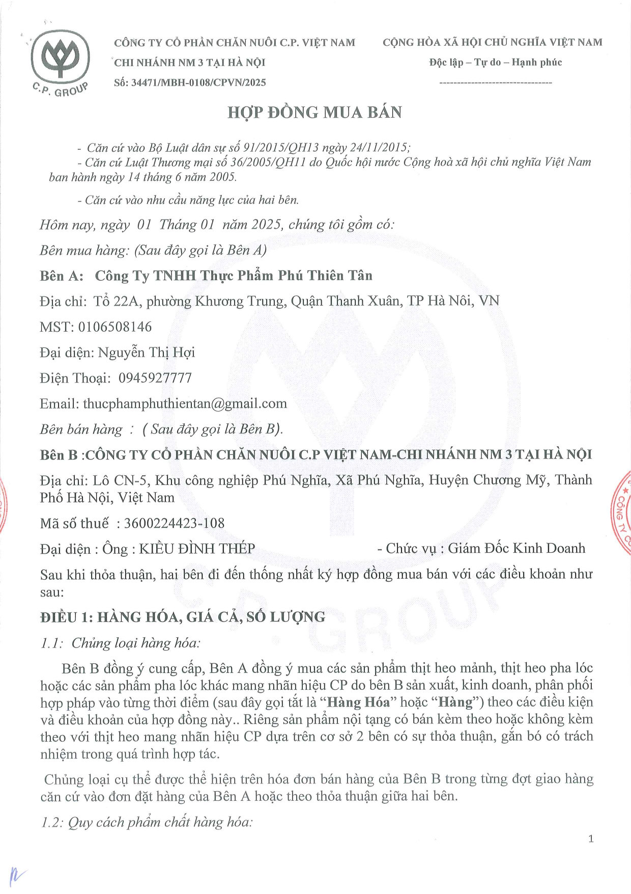 1. Xuất xứ của sản phẩm -Công ty Phú Thiên Tân đang hợp tác với Công ty CP Chăn nuôi CP Việt Nam - CN NM3 Tại Hà Nội (là thương hiệu hàng đầu tại Việt Nam, cung cấp sản phẩm thịt lợn truy xuất nguồn gốc được các tổ chức, người tiêu dùng quan tâm và tin tưởng). -Hồ sơ Công ty CP Chăn nuôi CP Việt Nam - CN NM3 Tại Hà Nội +GCN Vietgahp số VIETGAP-CN-19-19-01-003 ngày cấp 20/04/2022 + GCN đăng ký doanh nghiệp số 3600224423-108 ngày cấp 03/06/2020 + Địa chỉ:Lô CN-5, KCN Phú Nghĩa, Xã Phú Nghĩa, Huyện Chương Mỹ, Thành phố Hà Nội, Việt Nam + Số điện thoại: