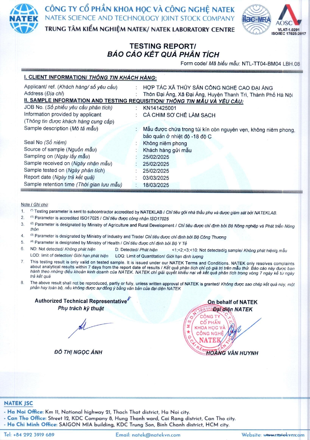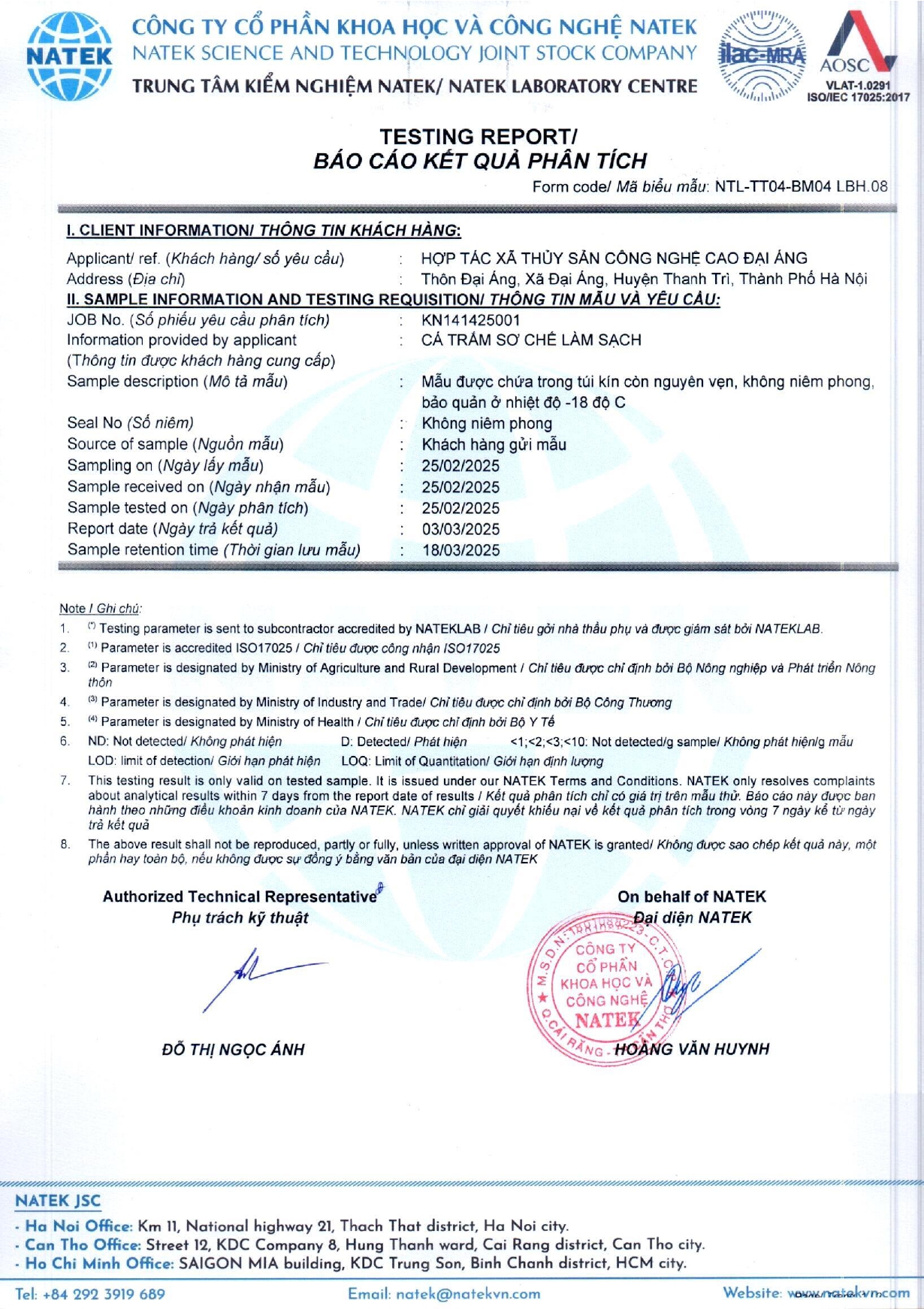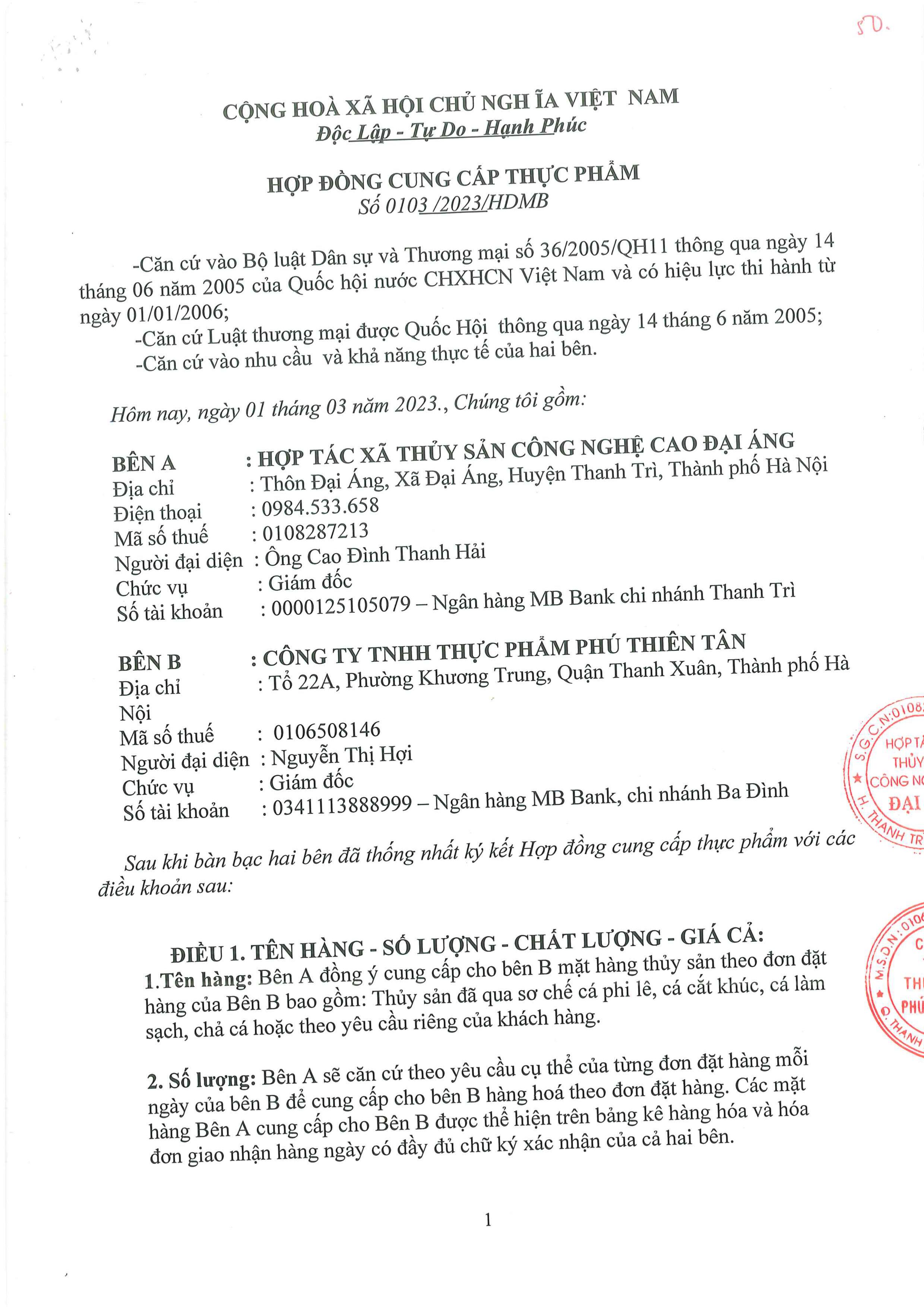 - Hợp tác xã thủy sản công nghệ cao Đại Áng hiện ký sử dụng và phân phối với Tập đoàn thức ăn chăn nuôi CJ của Hàn Quốc hiện thuộc top 10 thương hiệu uy tín nhất thị trường Việt Nam. Thức ăn chăn nuôi do tập đoàn CJ cung cấp đáp ứng đầy đủ nhu cầu dinh dưỡng phát triển cho cá từ giai đoạn con giống đến khi thu hoạch bao gồm protein, canxi các loại vi lượng khoáng chất và tuyệt đối không có các chất kích thích tăng trưởng.