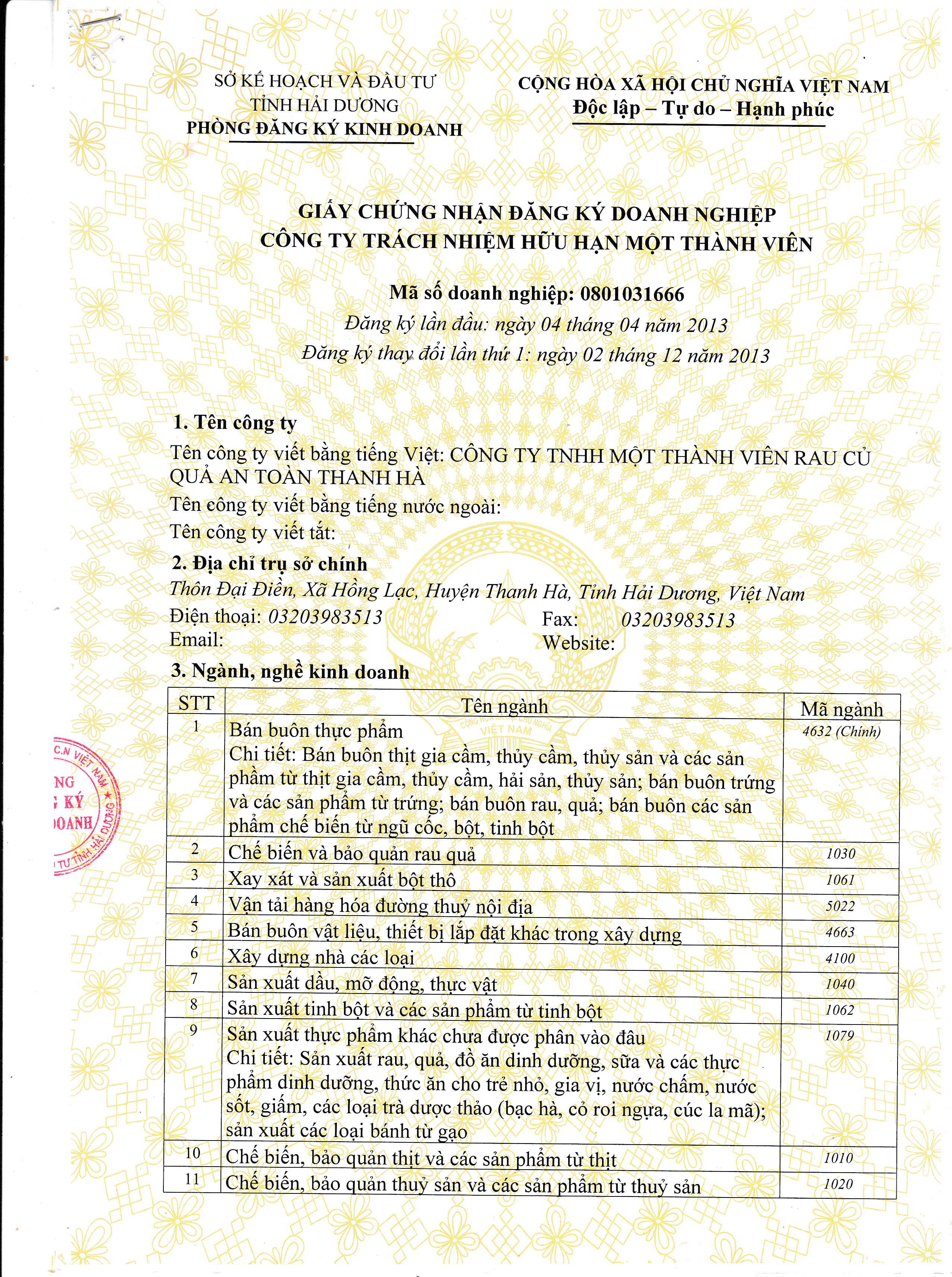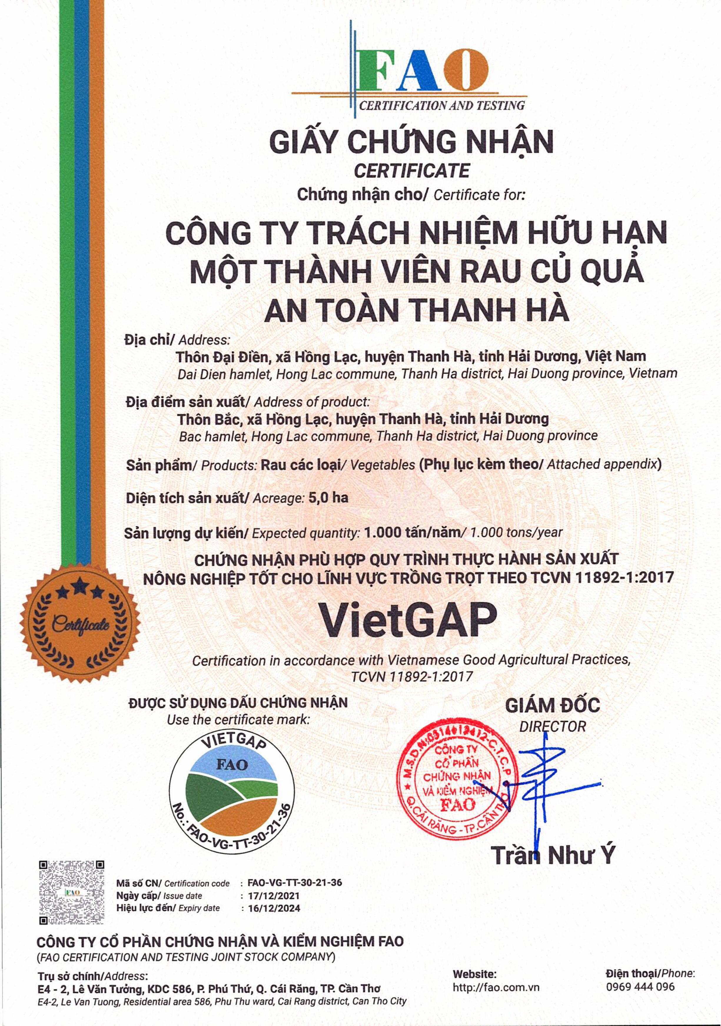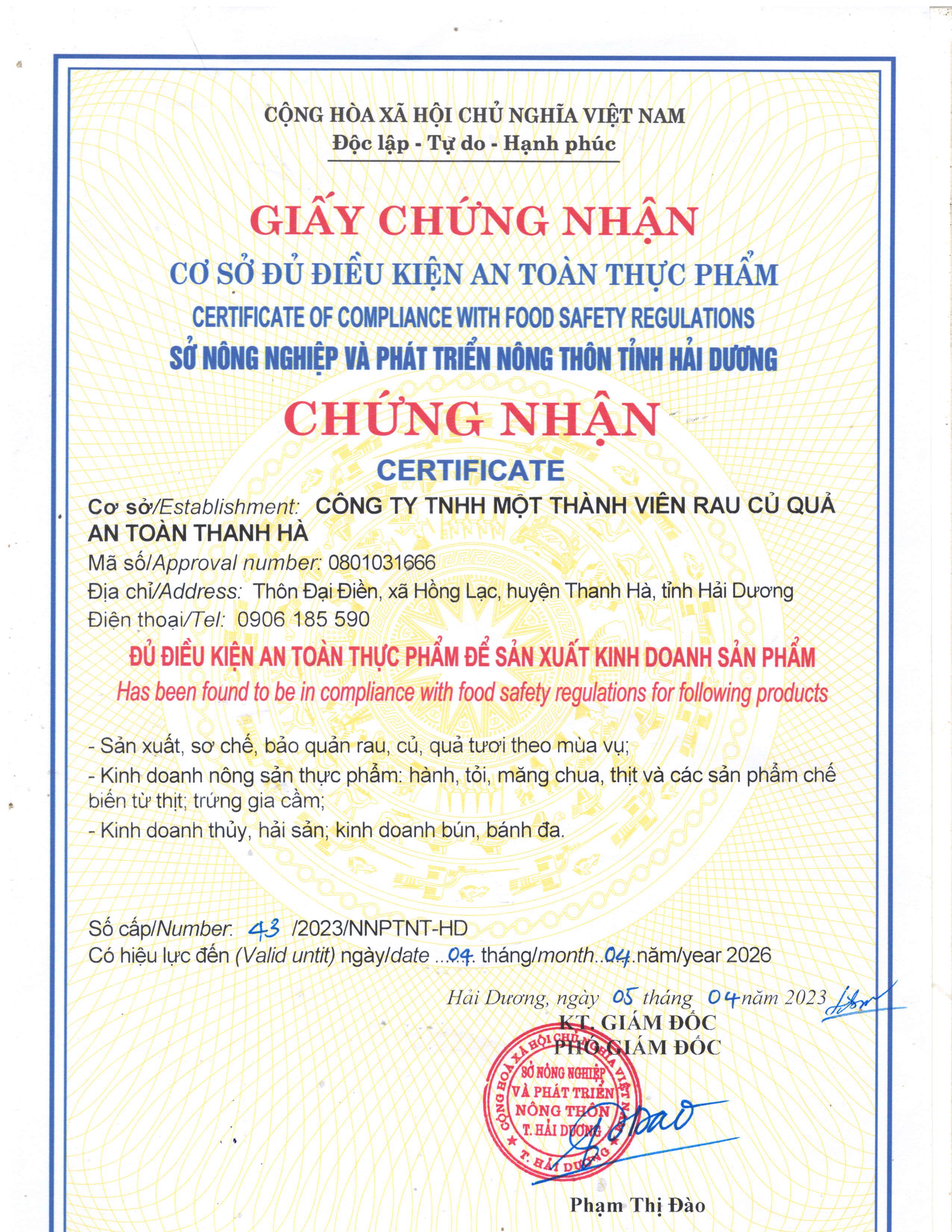 Nhà cung cấp Công ty TNHH MTV rau củ quả an toàn Thanh Hà