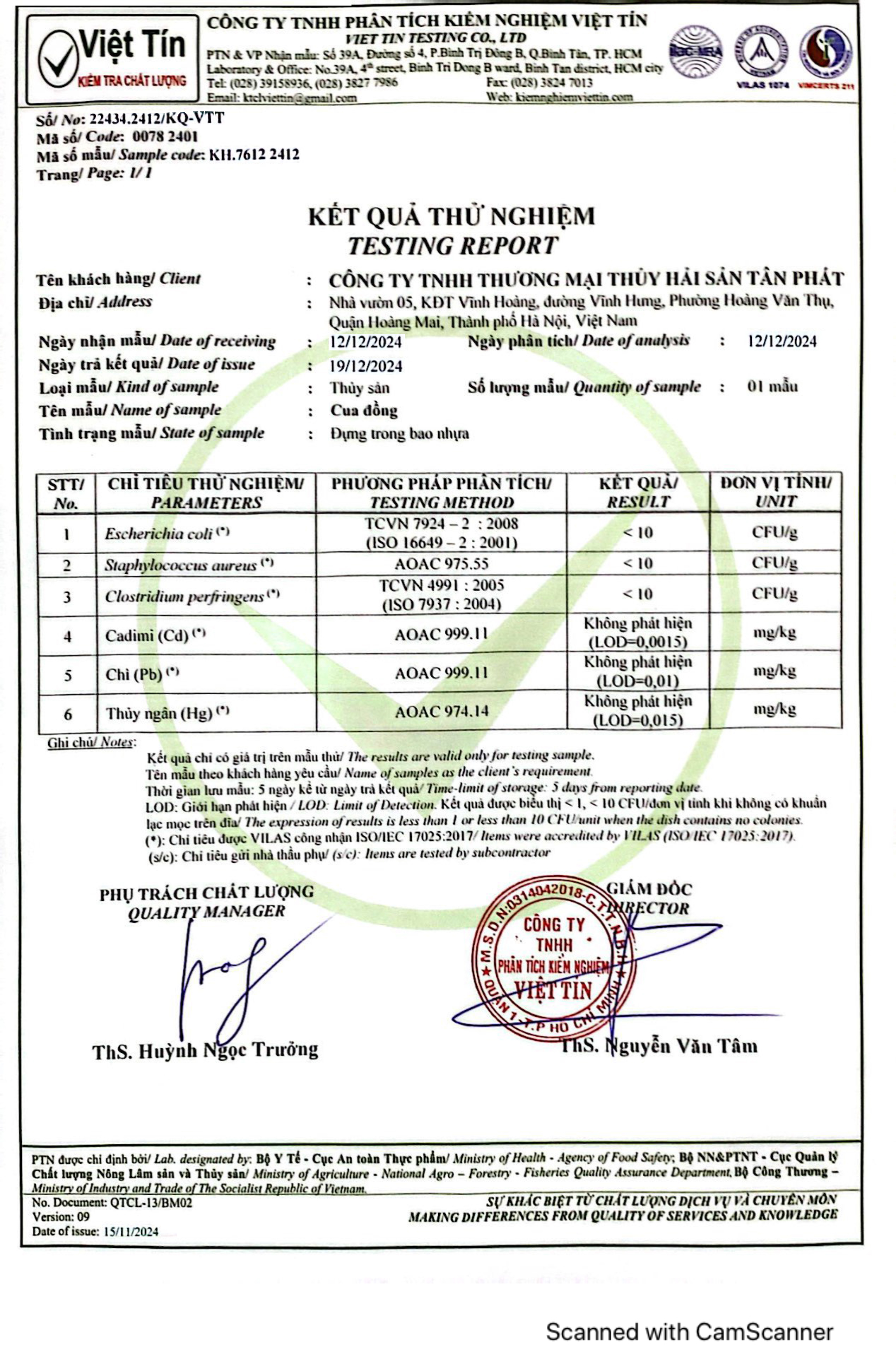 -Công ty TNHH Thủy sản Tân Phát thực hiện kiểm tra xét nghiệm chất lượng sản phẩm định kỳ, ngày xét nghiệm 04/01/2024