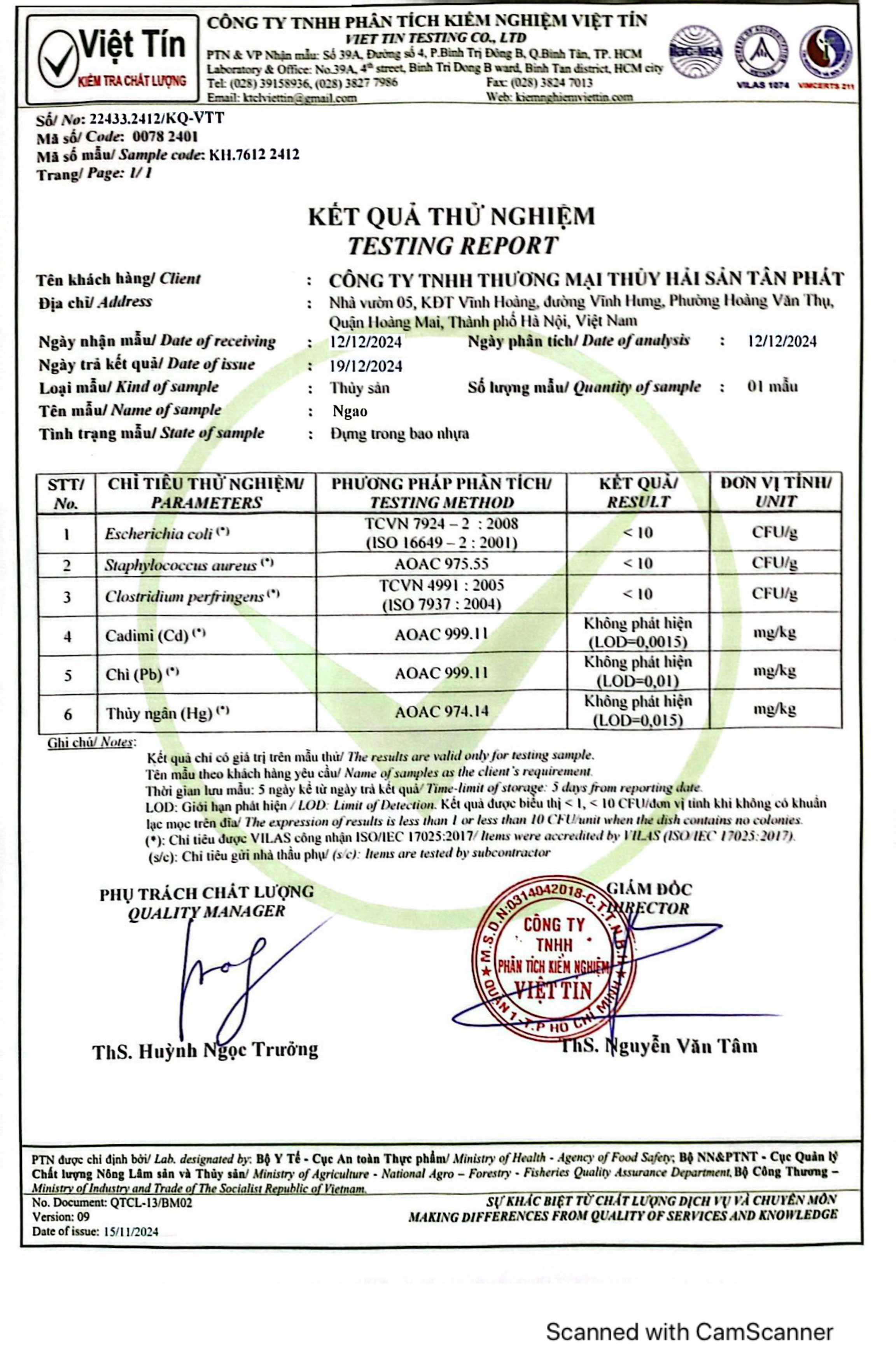 - Để có thể mua được những con ngao, con tôm tươi sống, an toàn vệ sinh thực phẩm, các bạn nên tìm đến những nơi cung cấp thực phẩm sạch để đảm bảo sức khỏe cho chính bạn và cho cả gia đình bạn. Thực phẩm Phú Thiên Tân chúng tôi tự hào là một trong những nhà cung cấp thực phẩm sạch uy tín tại Hà Nội- Công ty Thực phẩm Phú Thiên Tân nhập hàng hải sản của nhà sản xuất là Công ty TNHH Thương mại Thủy hải sản Tân Phát tại địa chỉ Nhà vườn 05, KĐT Vĩnh Hoàng, Đường Vĩnh Hưng, Phường Hoàng Văn Thụ, Quận Hoàng Mai, TP Hà Nội, Việt Nam.- Công ty TNHH Thủy sản Tân Phát đạt chứng nhận hệ thống quản lý chất lượng Vệ sinh ATTP HACCP ngày cấp 01/03/2024, hết hạn 28/02/2027-Công ty TNHH Thủy sản Tân Phát thực hiện kiểm tra xét nghiệm chất lượng sản phẩm định kỳ, ngày xét nghiệm 04/01/2024