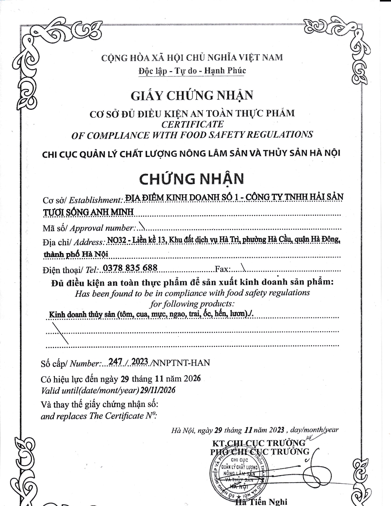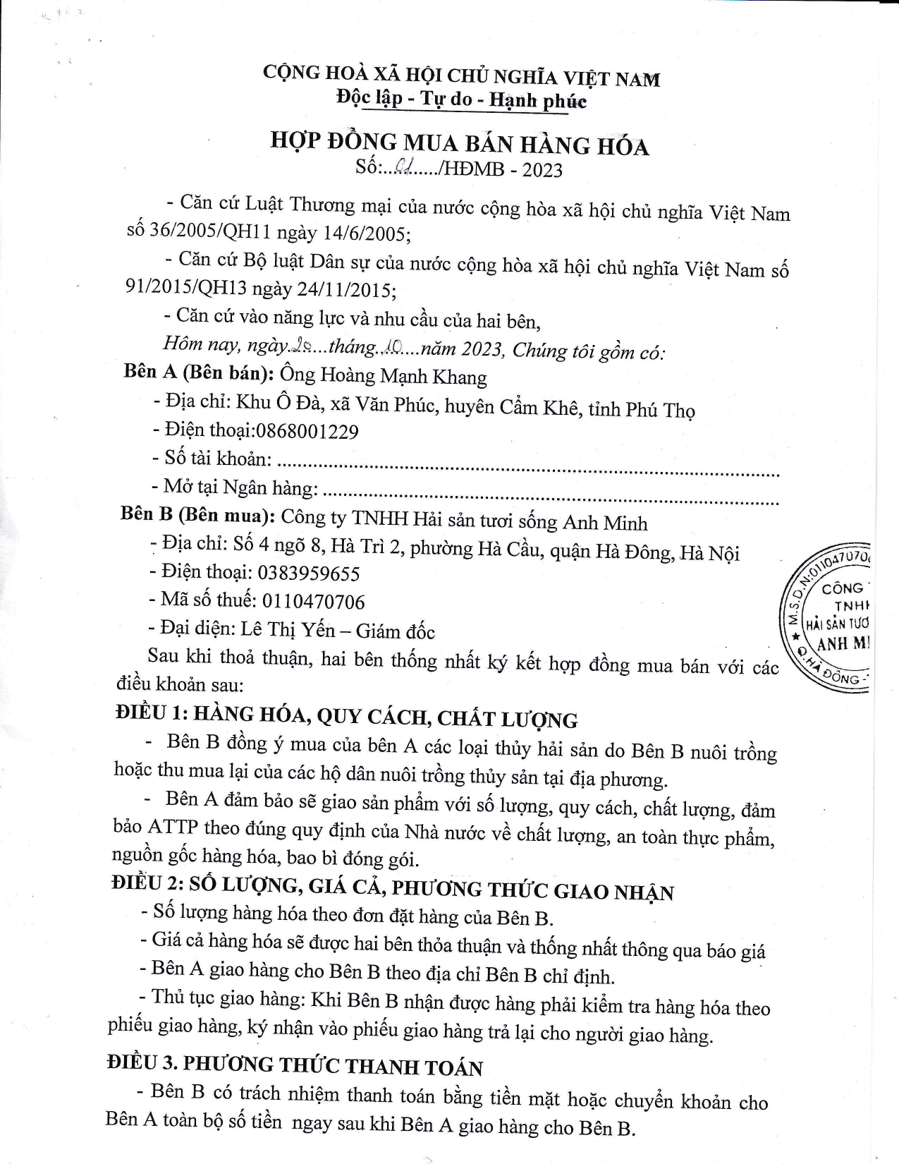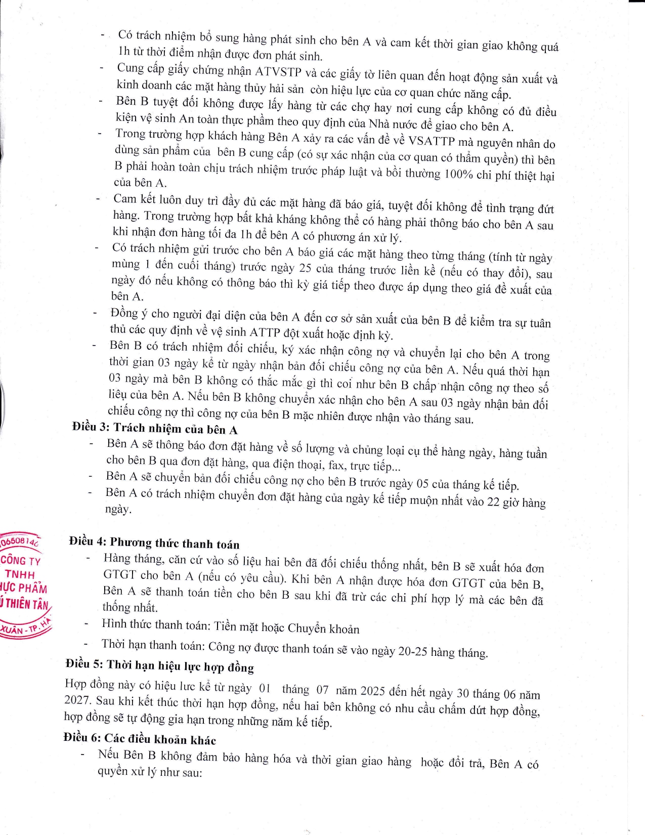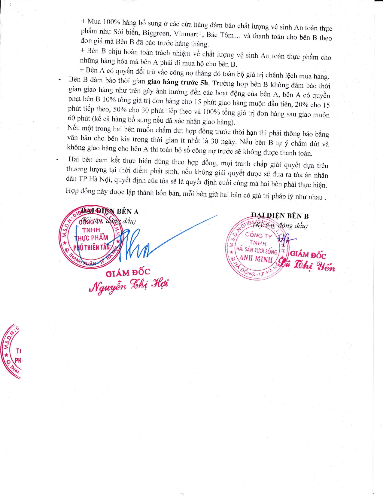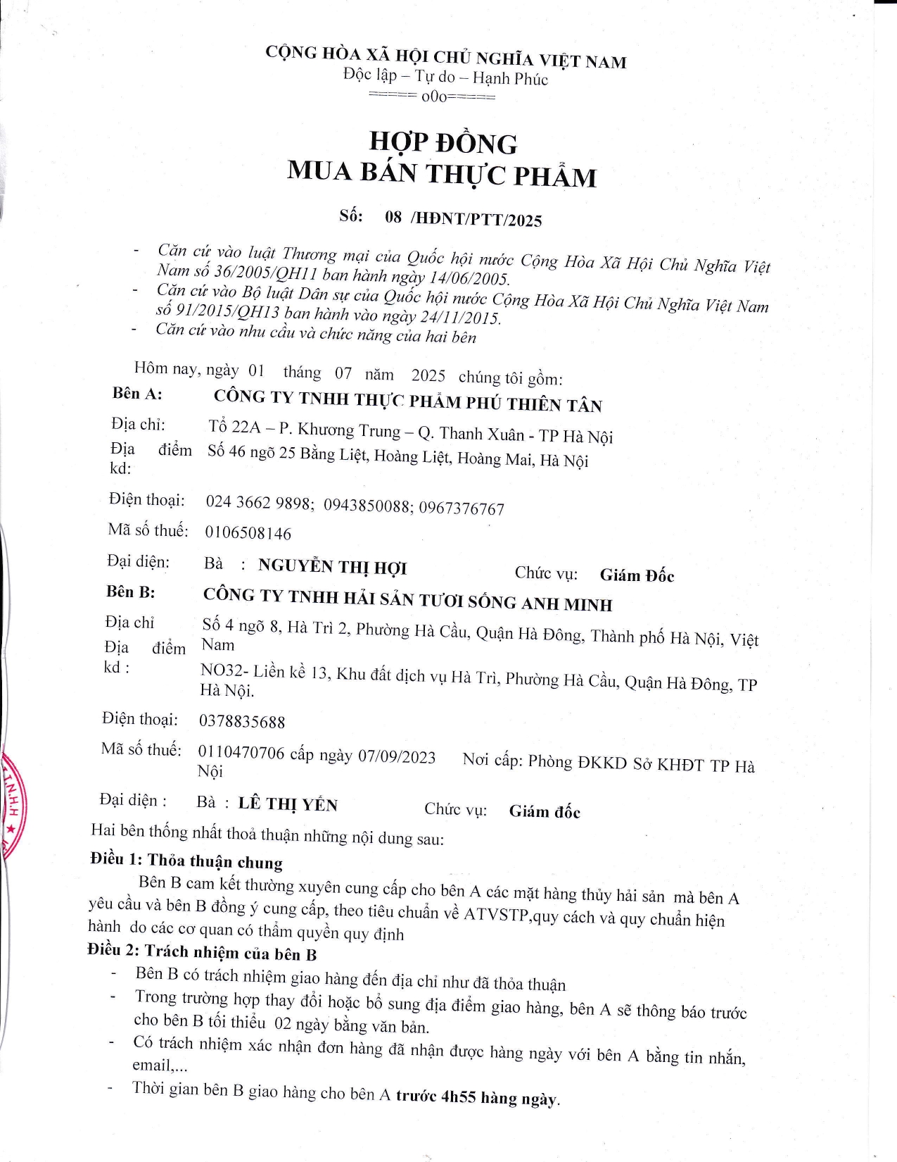 Công ty Thực phẩm Phú Thiên Tân ký hợp đồng mua các mặt hàng thủy hải sản tươi sống của Công ty TNHH hải sản tươi sống Anh Minh- Địa chỉ: Số 4 ngõ 8, Hà Trì 2, Phường Hà Cầu, Quận hà Đông, Thành phố Hà Nội- Địa điểm KD: NO32- Liền kề 13, Khu đất dịch vụ Hà Trì, Phường Hà Cầu, Quận Hà Đông, TP Hà Nội- Số điện thoại: 0378835688- Giấy chứng nhận đủ điều kiện ATTP số 247/2023/NNPTNT-HAN hạn đến 29/11/2026