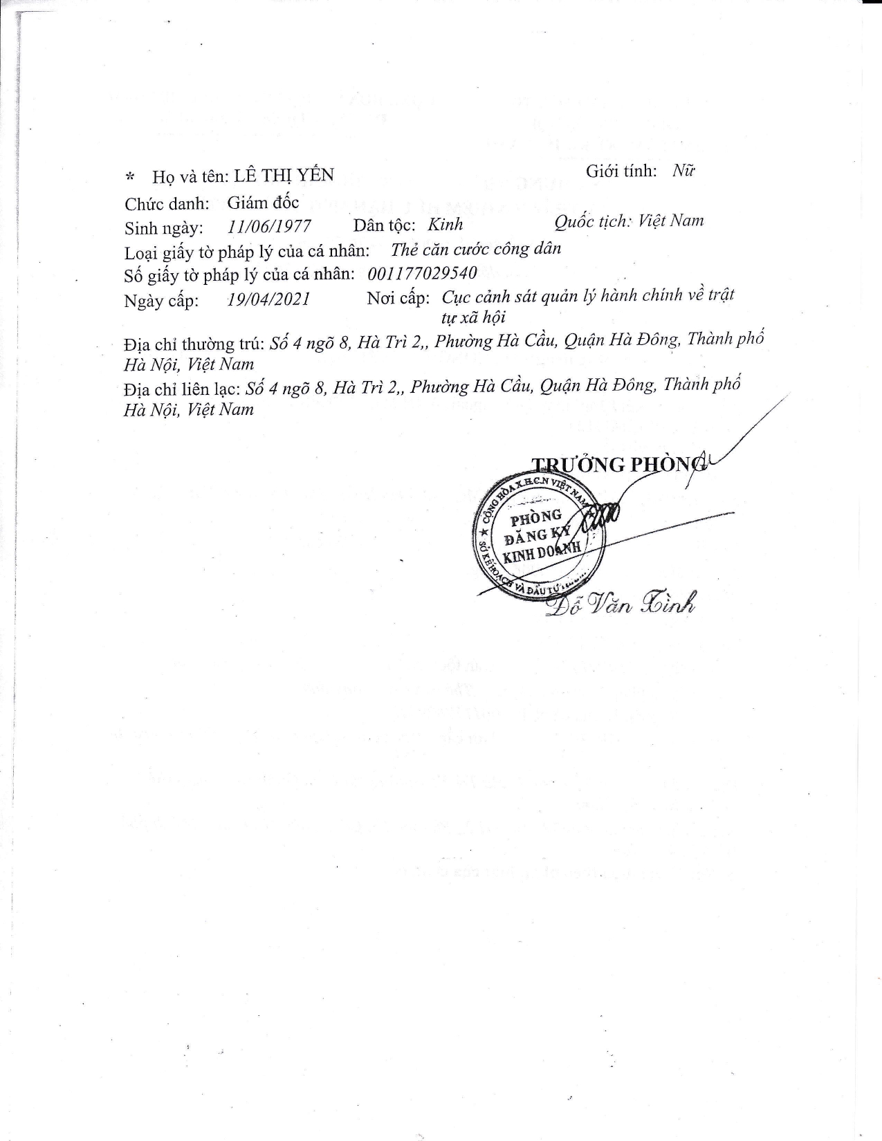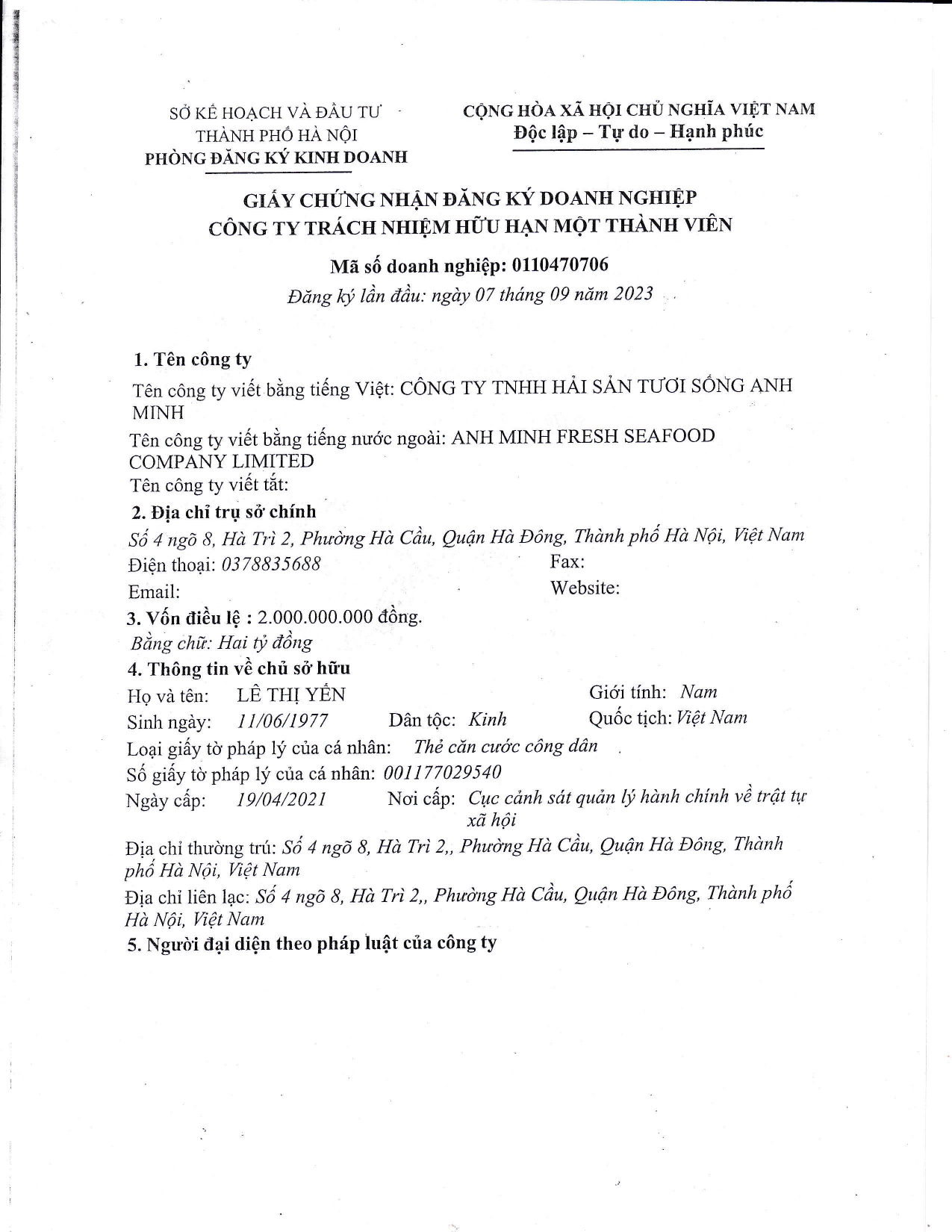 Đại diện pháp luật: Bà Lê Thị Yến.